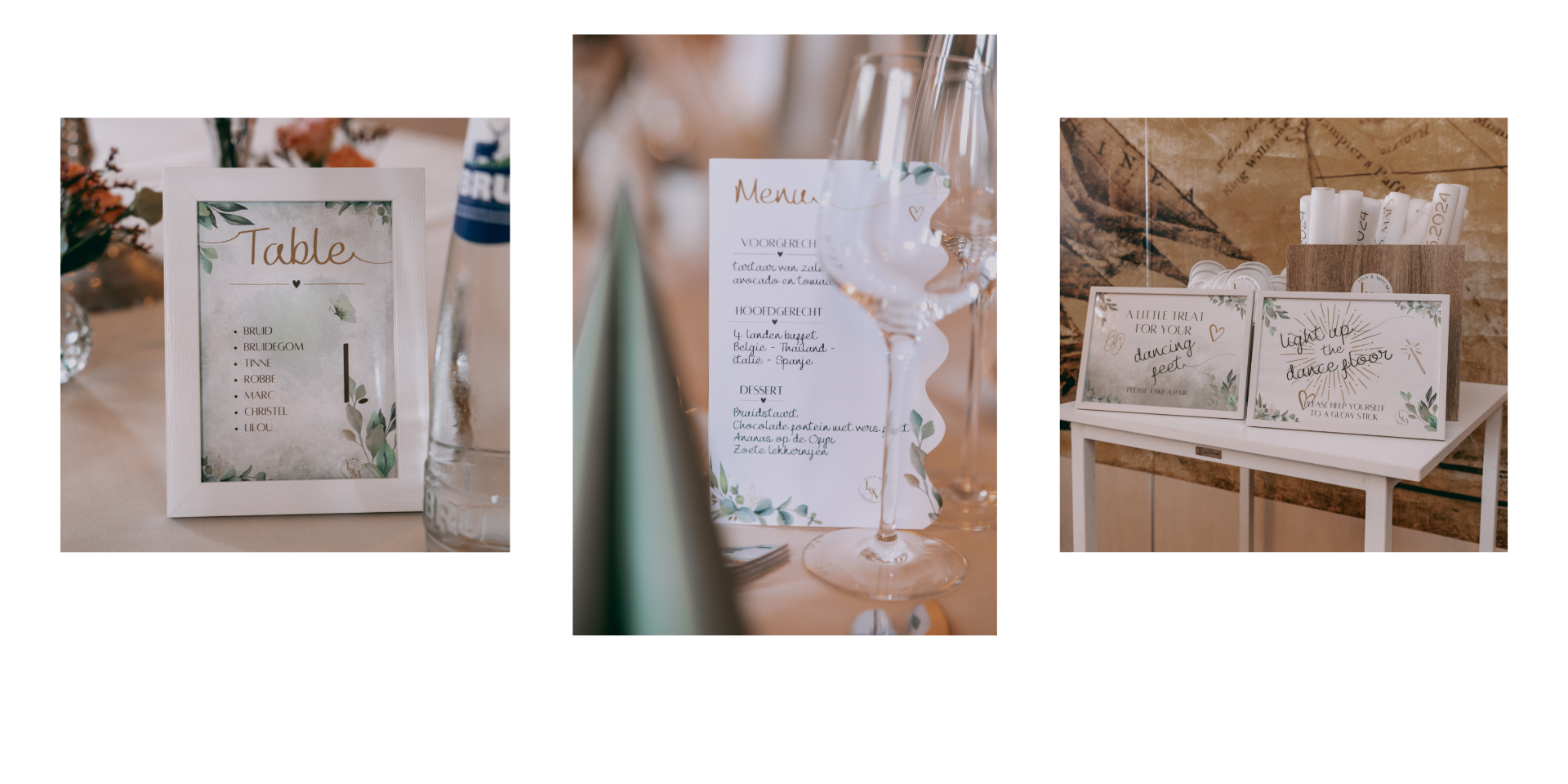 Jullie liefde in een eigen stijl, tot in de details. Van uitnodiging tot tafelkaartjes — ik denk graag mee.